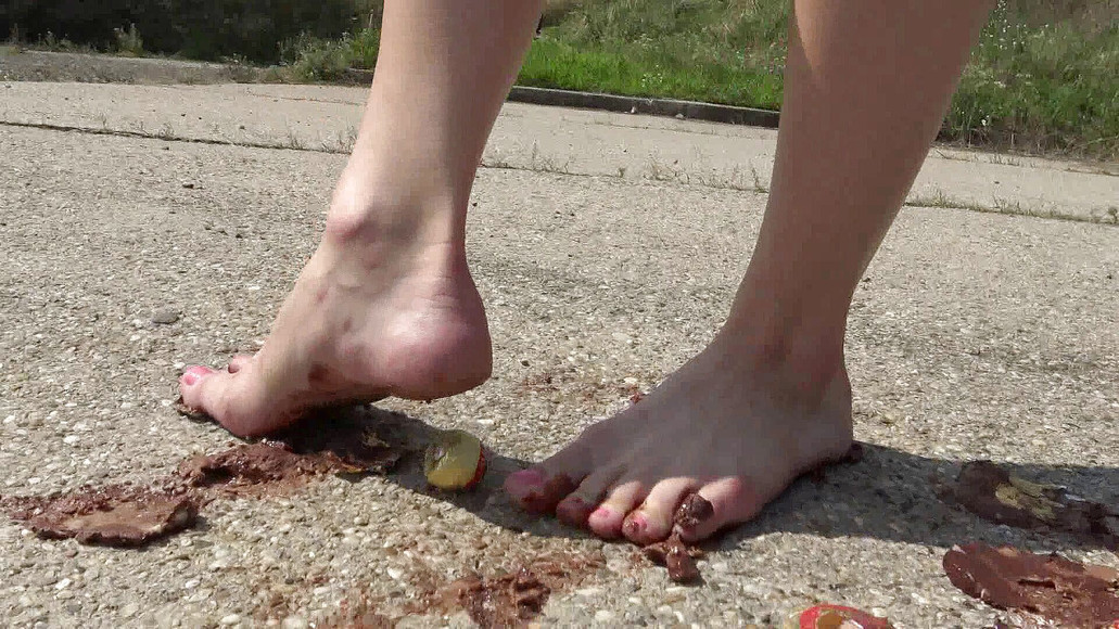Amber crushes a whole row of Mozart balls on the hot asphalt with her bare feet. We'll see the chocolate balls being mashed under her feet and the brown chocolate sauce sticking sticky to the soles of her feet before she stomps the next ball into the ground again.