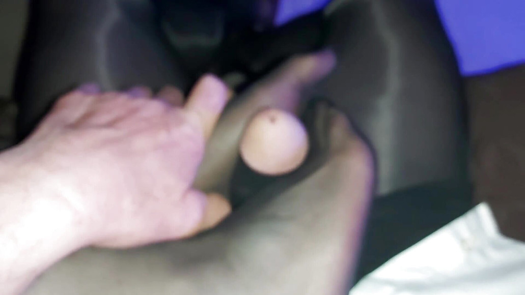 The wife uses her talented feet in black stockings to massage my open sheath nylon cock making it throb with anticipation of what's to come.