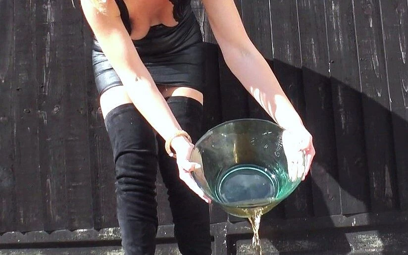 Here's Epeephany Jones relieving herself - first on the garden path, then into a bowl in the lounge where she mixes it with some fizzy drink. Taking out to the garden she gives her slave a treat by making him drink it! Plus two other scenes of the gorgeous girl attempting to pee - it doesn't work every time!