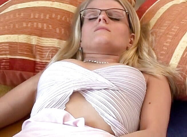 Spex blonde wearing stockings gets fucked by machine and rubs her twat with vibrator.