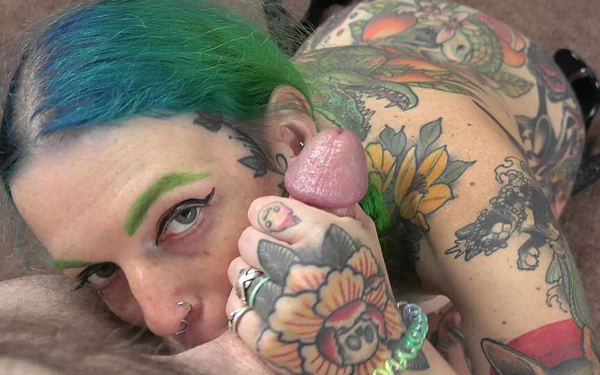 Tattooed hottie Vibe Ryder is in a skimpy dress for some hot jerk off instruction. She gets naked, then drops to her knees for a raunchy POV blowjob with Logan.