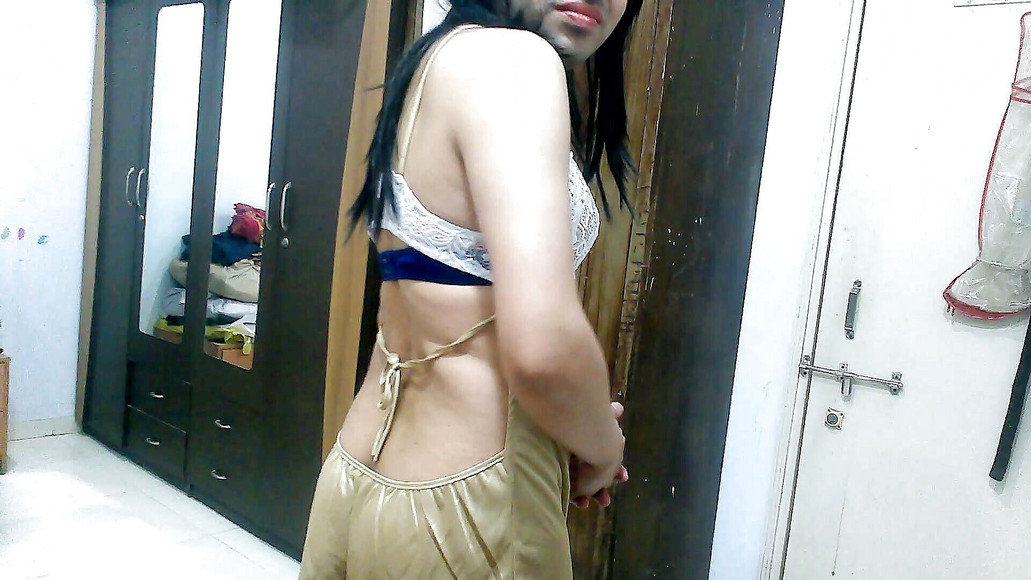 Hot sissy crossdresser femboy Sweet Lollipop in sexy golden-white satin-lace babydoll lingerie with a sheer black thong and purple bra. Removes her lingerie, shows her gloryhole, plays with her dick, and shows her sexy nude body.